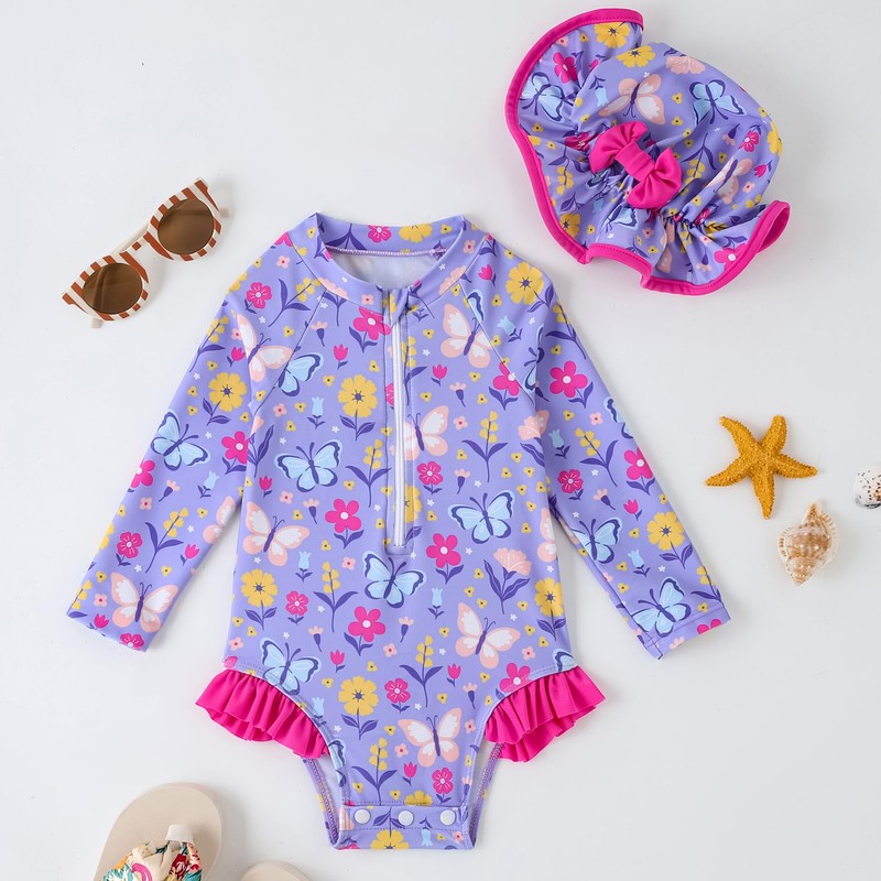 - DESIGN: One-piece rash guard with hat,strawberry, flower, butterfly, fish scale, and various other cute patterns of swimsuits are the best gifts for baby girls this summer