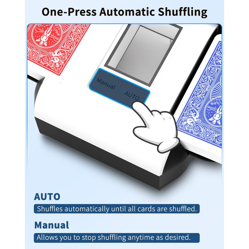 - 【Two Shuffling Modes】 Fully Auto & Semi-Auto. Press the "Auto" button to shuffle all cards with a single press, stopping automatically when finished. For Semi-Auto, press and hold the "Manual" button to shuffle, and release to stop instantly. Our shuffler supports up to 2 decks at once.