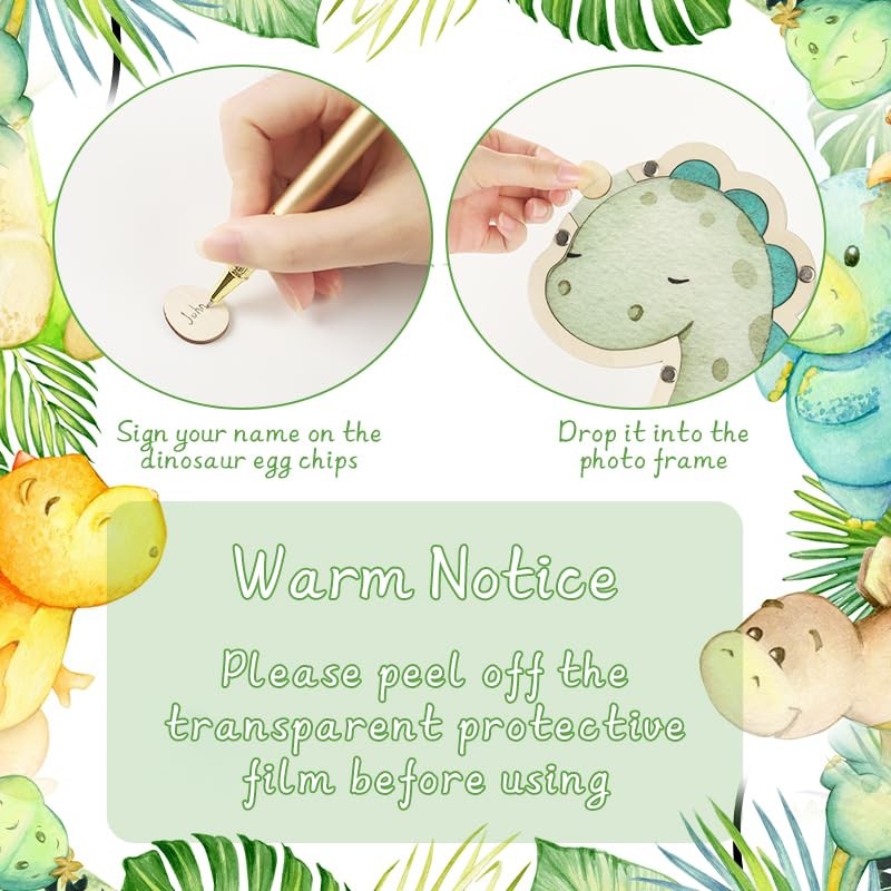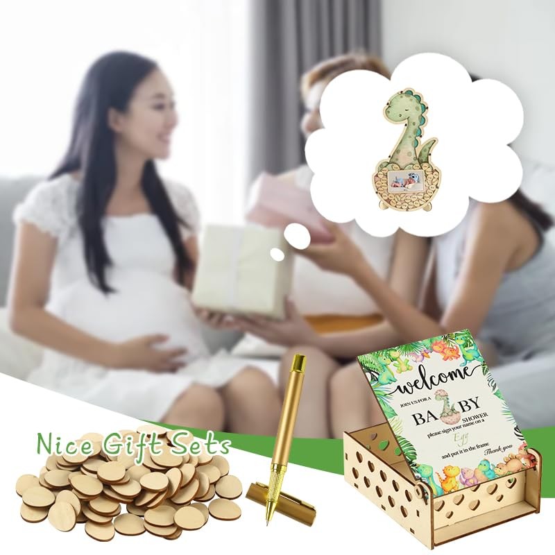 - Baby Birthday Shower Set: The dinosaur baby shower decorations include 1 dinosaur themed wooden picture frame with display stand, 1 dinosaur themed wooden box, 60 pcs wooden dinosaur egg slices, 1 golden pen (black ink), the practical set could well meet your various needs.