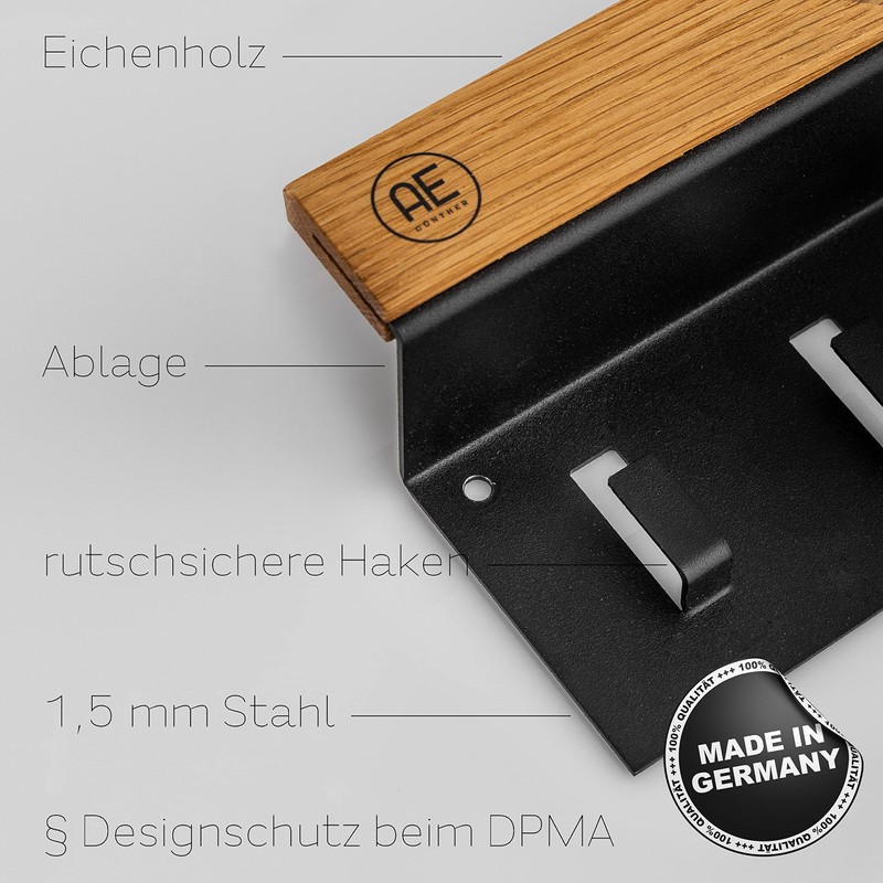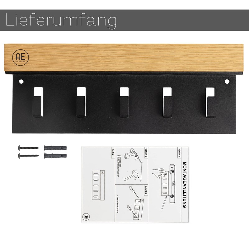 AE GÜNTHER® Wooden Key Holder, Key Holder, Black Steel, Oak Key Holder, Key Organiser with Shelf, Key Holder, Wall Organiser, Key Rack