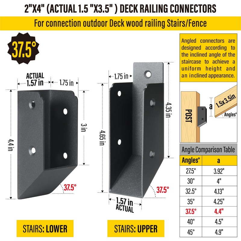 - SIZE ADAPTATION: The Deck Railing 37.5°Stair Connector is suitable for connecting standard 2" x 4" (Actually 1 ½" x 3 ½") wood components, Suitable for deck railing handrail connection installation