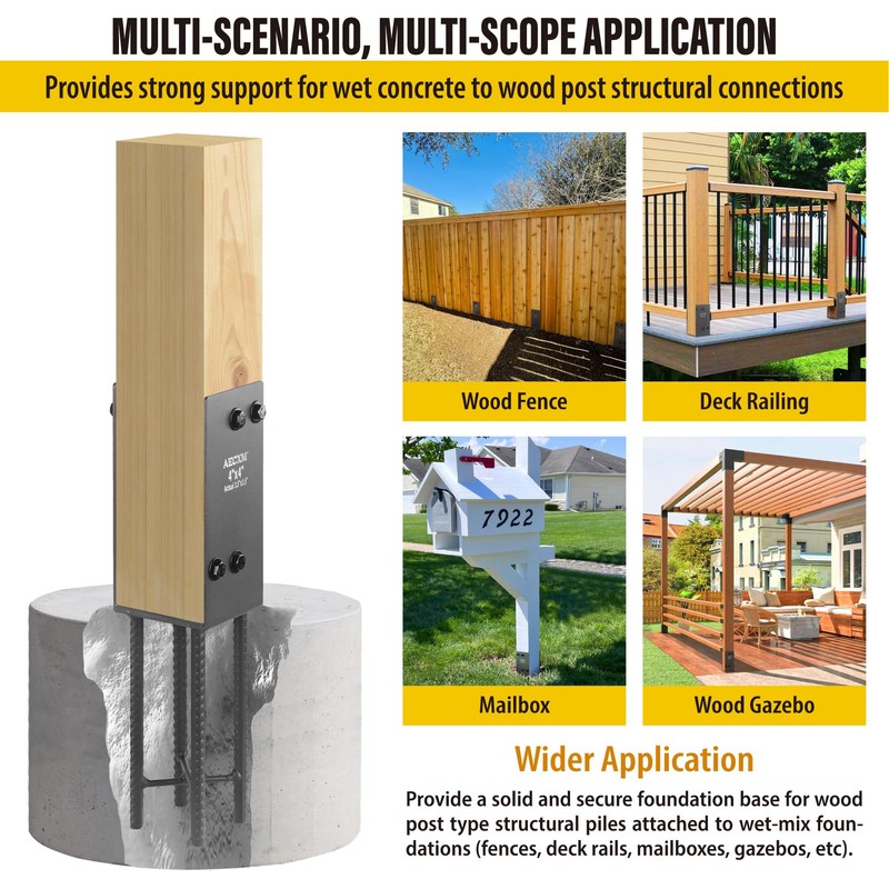 • SCOPE OF APPLICATION: U-shaped fence post base separates the wooden post from the wet concrete, Reduces the risk of moisture damage to the wood, Makes the wooden post more stable and has a longer service life. It can be used as a connection between wooden post foundations of Deck railings, Fences, Mailbox, Terrace psotbase, Wood Gazebo, etc., And Wet concrete foundations