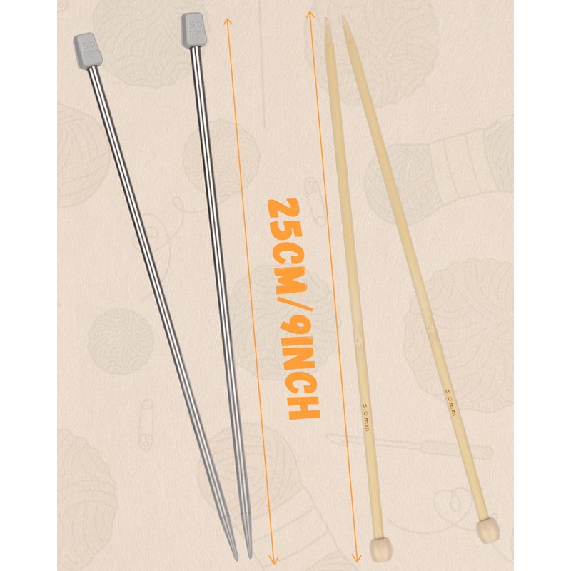 - Knitting Set for Wipe: Ideal knitting kit for beginners to learn new skills and make practical and beautiful fabric sets with the family. The knitting set contains all the DIY materials you need to start your knitting journey with ease. This set contains 2 knitting needles wood 5.0 mm, 2 knitting needle set metal 5.0 mm, 4 wool, 6 sewing needles, 1 needle gauge, 1 scissors, 1 instructions (English language not guaranteed). Once you've learned that, you can move on to more complex things or finer materials