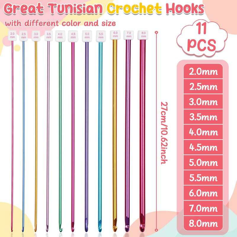 - [ Extra Long Crochet Needle Size ]: Afghan crochet hook is 10-1/2 inches long, with different colors and sizes. 2.0 mm, 2.5 mm, 3.0 mm, 3.5 mm, 4.0 mm, 4.5 mm, 5.0 mm, 5.5 mm, 6.0 mm,7.0 mm and 8.0 mm. Sizes are marked on the beads at the end of the crochet hook, easy to identify and select.