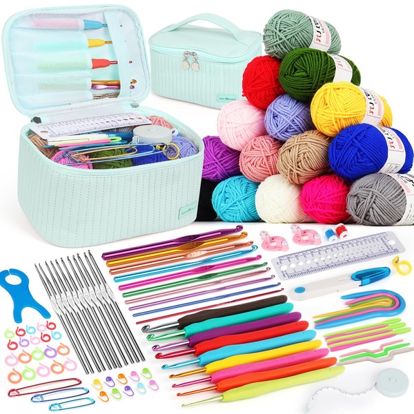 - Aeeque crochet set for beginners: 100 complete crochet set: acrylic wool x15, TPR handle crochet hook x12, lace crochet hooks x12, aluminium metal crochet hooks x10, 51 pieces practical crochet accessories. The crochet set has a very good feel, so that the wool glides very well. It comes with a complete set of practical crochet kit making it perfect for starting crochet.