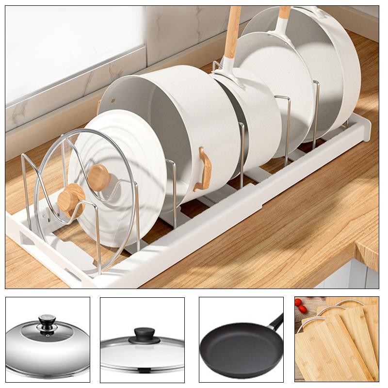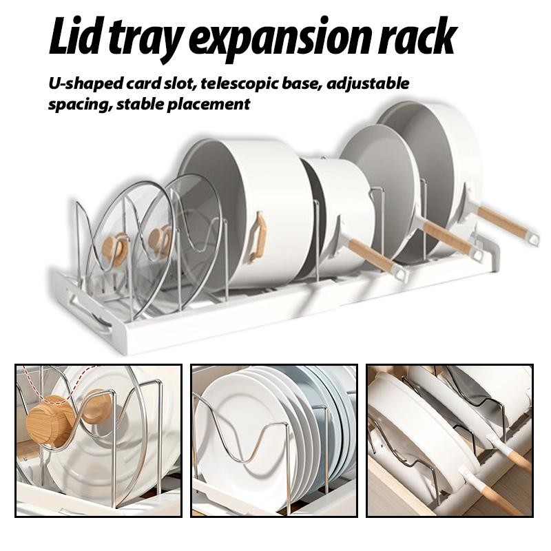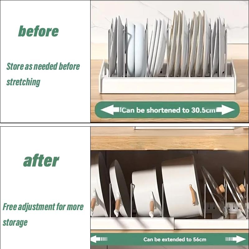 - 0:00 0:48 „ÄêAdjustable Design„Äë This adjustable 7-section pan organizer expands from 11.81 to 22.05 inches, providing customizable storage for cookware like frying pans, trays, and cutting boards. It keeps items upright and easily accessible, optimizing cabinet space. „ÄêSpace Saving„Äë This space-saving pot rack organizer efficiently stores pots, pans, lids, plates, cutting boards, and more. Its versatile design fits in cabinets, countertops, or under sinks, transforming cluttered spaces into organized areas. „ÄêEasy to install„Äë This pots and pans organizer can be installed in just a few minutes - just stretch the base to the length you want and securely secure the partitions in place. No tools are needed for installation and it is very convenient.