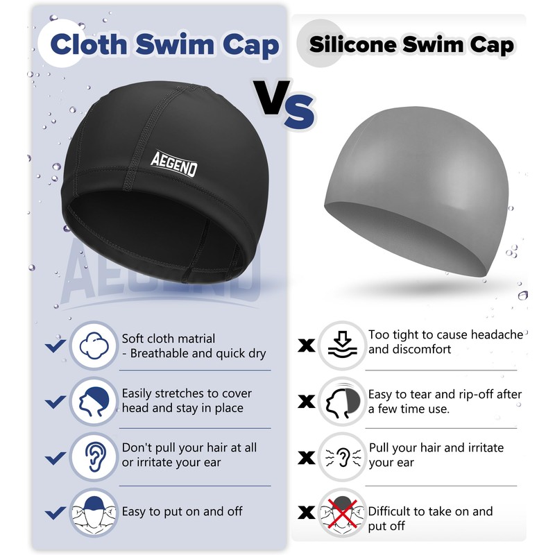 - High Elasticity & Tear-proof - High elasticity with fabric material ensures our swim cap stay in place without being too tight, and won't cause too much pressure to head. Easy to put on and off. Compared with silicone swim cap, our cap is much of sturdiness for long-term use without distortion or rip.