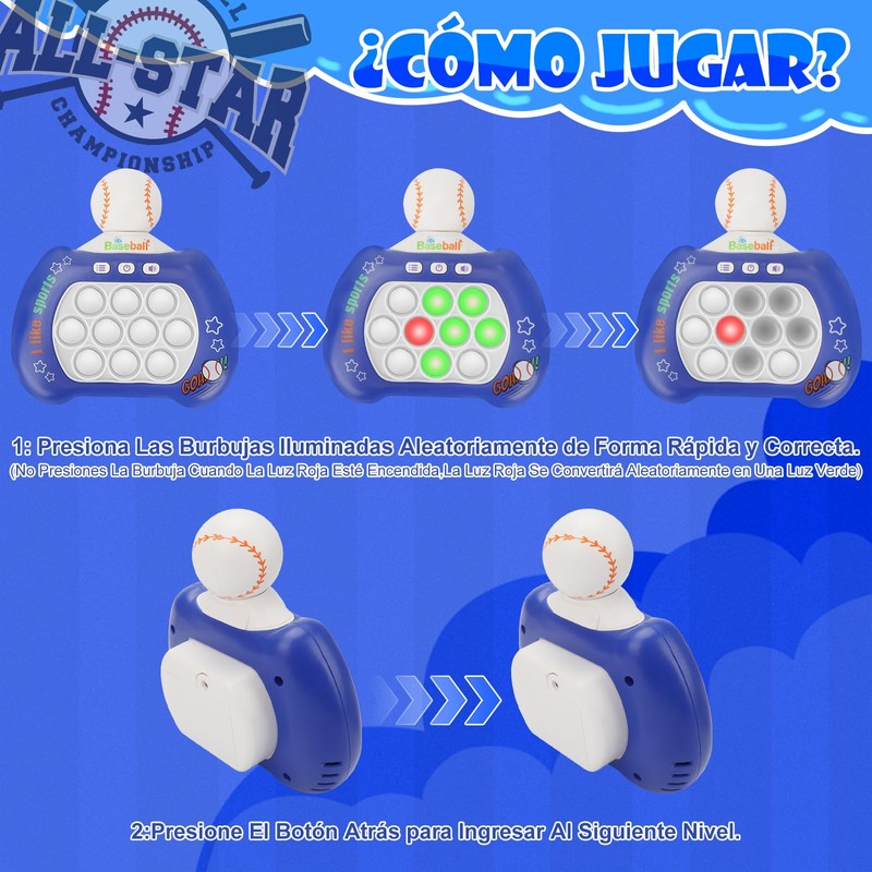 - ⚾【Promueve El Pensamiento y Las Reacciones Positivas】 Los atractivos desafíos del juego estimulan el pensamiento positivo y las reacciones rápidas, mejorando la coordinación ojo-mano, la velocidad de reacción, la concentración, la memoria y las habilidades motoras finas. Fomenta el desarrollo sensorial de tu hijo a través de diferentes modos de juego. Al mismo tiempo, los Fidget Pop It Electronico pueden reducir el estrés, la fatiga o la ansiedad, brindarte paz interior y también pueden brindarte una relajación completa para hacer tus necesidades.