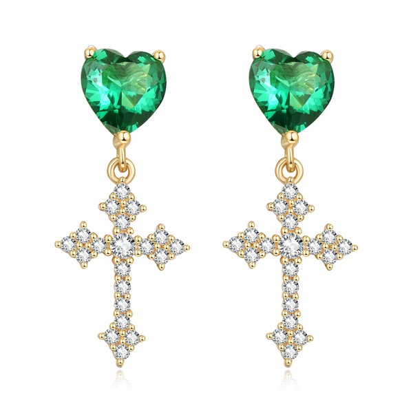 • 【Green Heart Dangle Cross Drop Earrings】: Elegant gold cross dangle earrings, features with small heart shaped simulated emerald and dangling cross, pretty for formal events like wedding, prom and match to daily casual cloth.