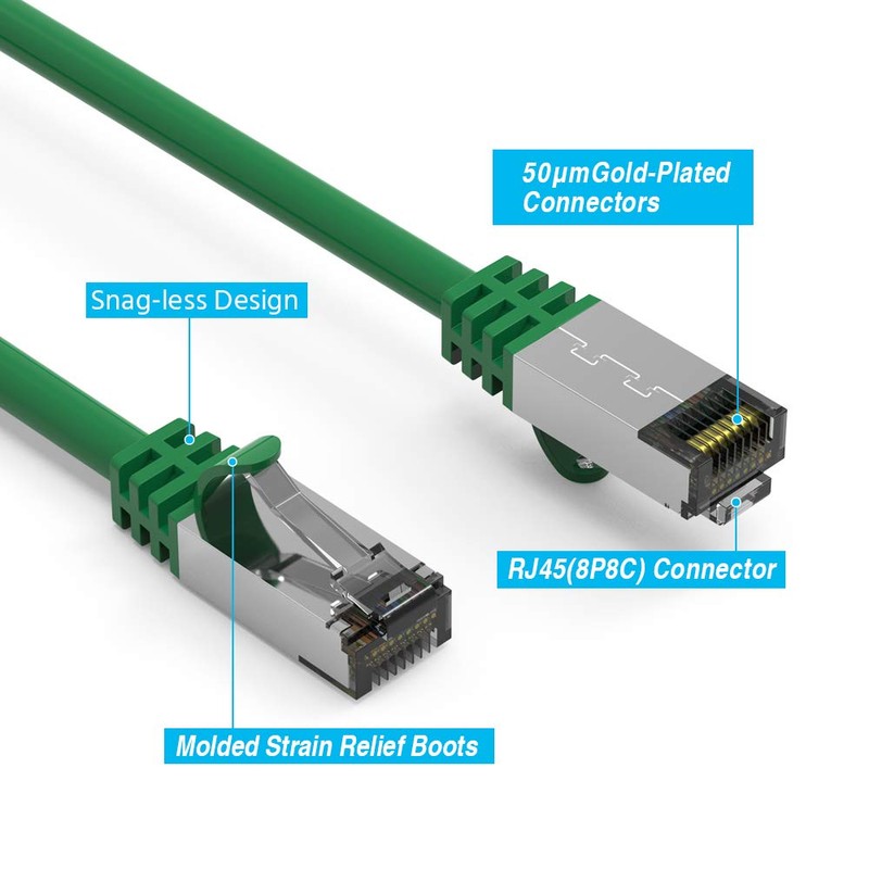 - The connectors with RJ45 plug with 50-micron gold plated contacts and strain-relief boots provide durability and ensure a secure connection. The snag-less bubble design protects the locking tabs on the RJ45 connectors from being damaged or accidentally snapped off.