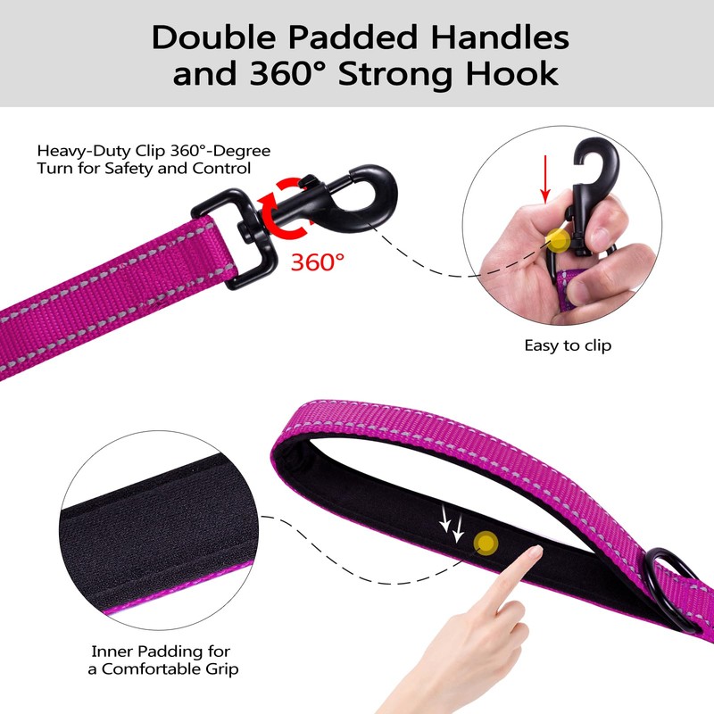 Aepeasti Dog Leash for Medium to Large Dogs with Two Padded Handles 5FT/6FT, Double Handle Dog Leash, Reflective Training Lead, Durable Traffic Leashes(5FT,Rose Red)