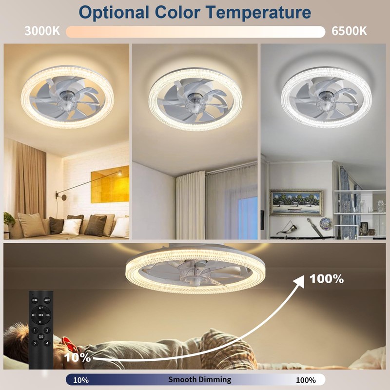 - Brightness Adjustment & Reversible Wind: This ceiling fan with light has 3 color temperature options 3000K-6500K. Brightness ranges from 10% to 100% available for your need for warm, comfortable lighting. Available year-round, it provides cool air in the summer and the reversible motor circulates the distributed air in the winter.