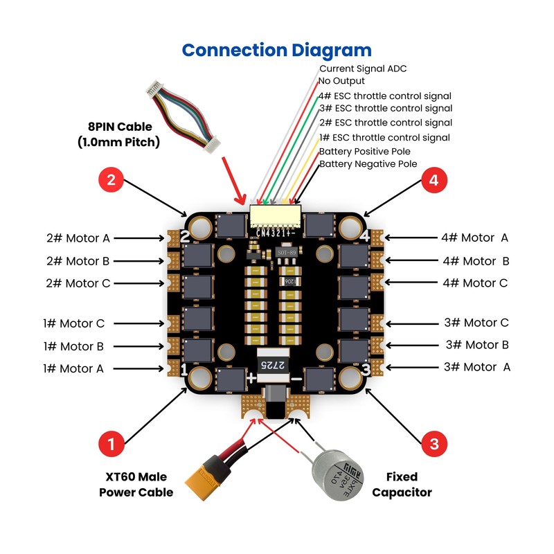 - Robust Protection Features: With stalling protection and natural cooling, the 4IN1-ESC-LDO operates reliably in diverse conditions, with a working temperature range of -10℃ to +55℃ and humidity tolerance of 10% to 95%, non-condensing.