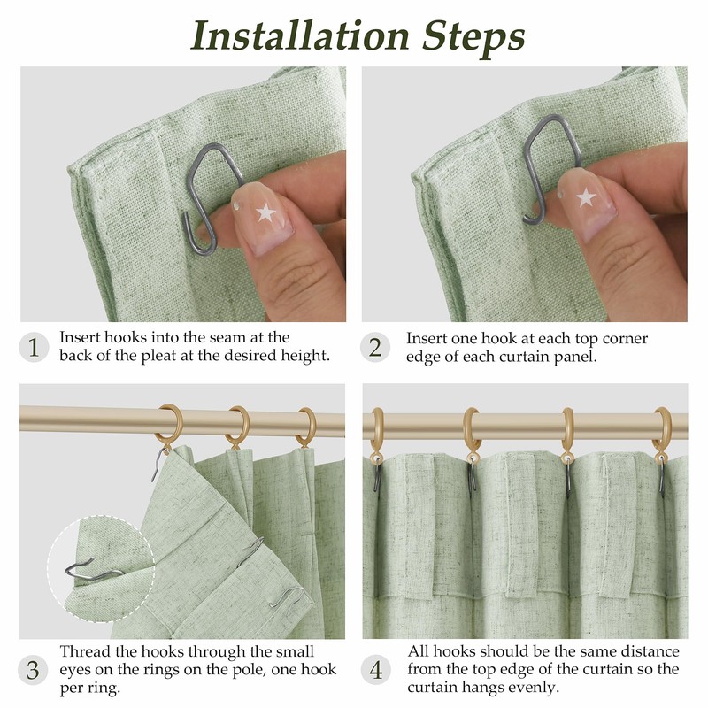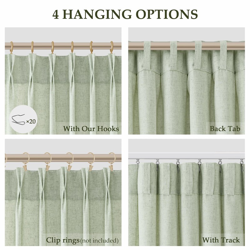 - Versatile Hanging Options: There are 3 hanging methods to choose from to meet your different home decorating needs. Method 1: Hanging with our hooks on poles or track to easy slide and creat a modern pleated effect. Method 2: Using back tab to hide the rod, easy to hang and showcase an elegant pleated look. Method 3: Using clip rings for easy, slide open and closed.(clip rings are not included). Install according to your preference