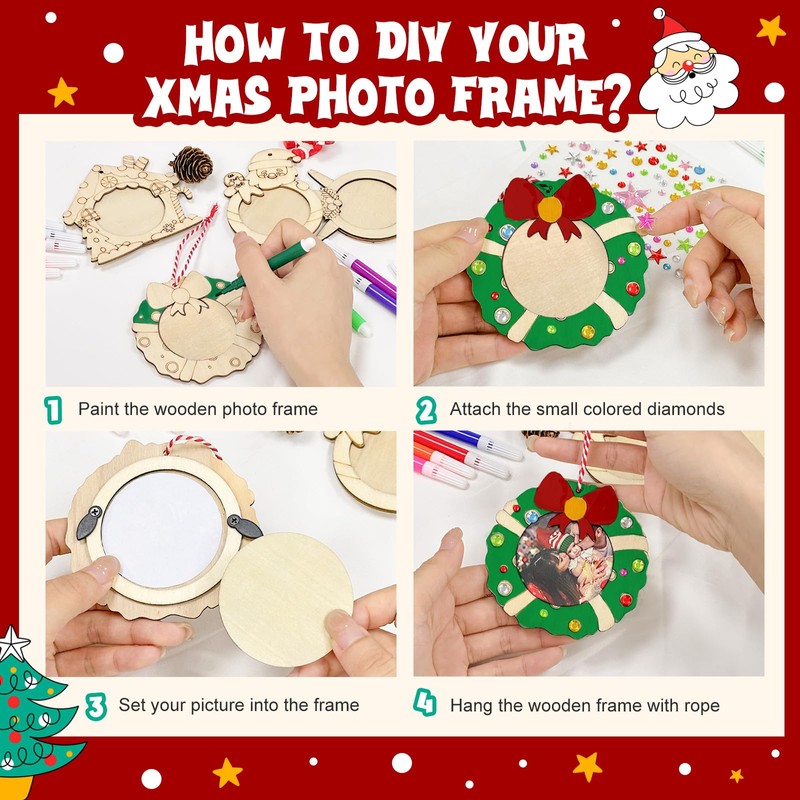 - 【DIY Photo Ornaments for Christmas Tree】Transform your Christmas memories into stunning keepsakes by coloring and decorating each Christmas picture frame. Simply add a photo, color the wood frame, or add some stickers to make each ornament unique. It will allow you to unleash your creativity and add a personal touch to your Christmas tree decorations. Get the whole family involved in the fun and create a joyful bonding experience.