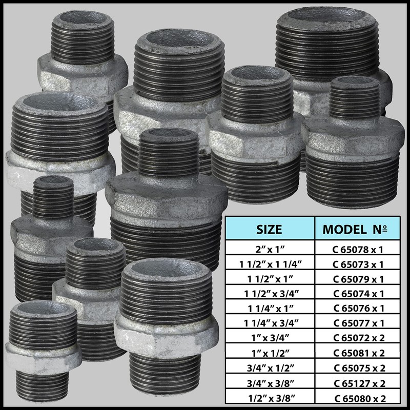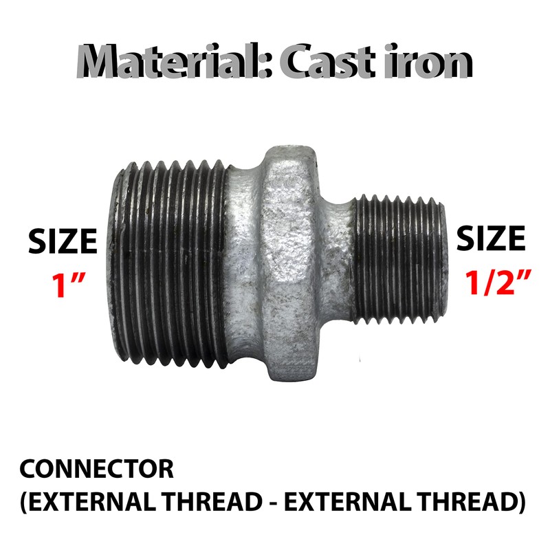 - Measurements: Reducing size: male to female 1" to 1/2" Material: cast iron. Finish: galvanised. Weight per piece: 127g The material has a long service life. Discover our wide selection of connectors with a wide range of sizes, materials and types. Discover our wide range of connectors with a wide range of sizes.
