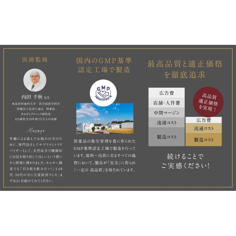 - 【医師監修】厳選素材を高配合したサプリで体の奥底から男の魅力を呼び戻す。 体に安心・安全の自然素材を配合。