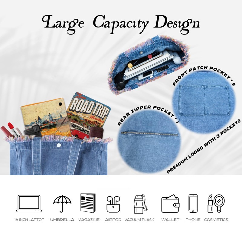- Canvas-Soft Blues with a Hint of Boldness A vintage-inspired blend of mid-blue denim and warm-toned fringe—softly structured in a canvas-textured body that makes a statement.