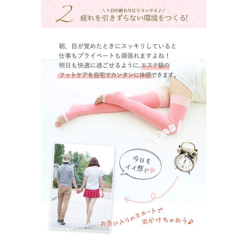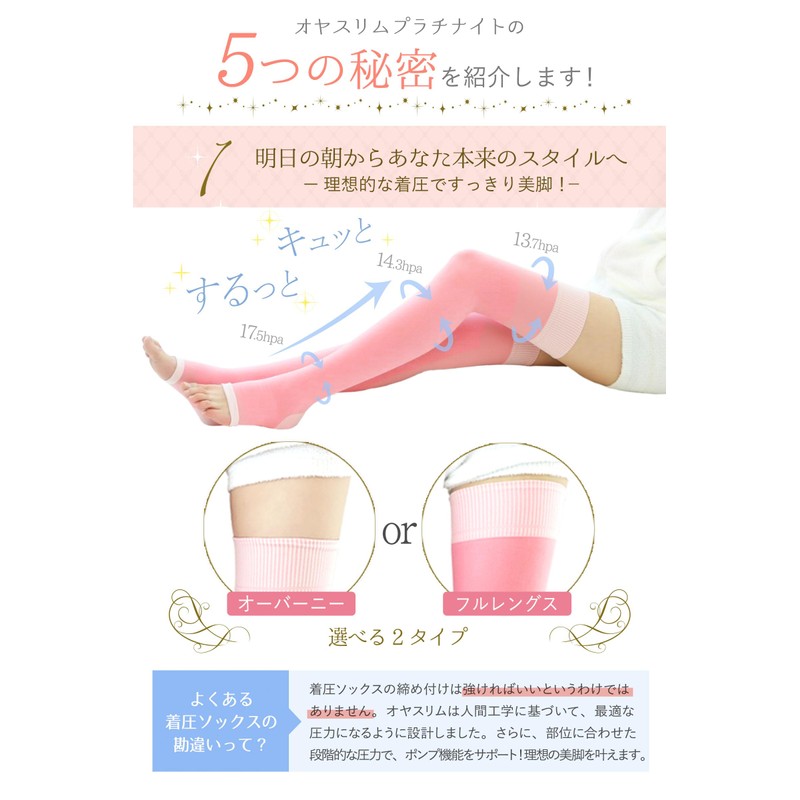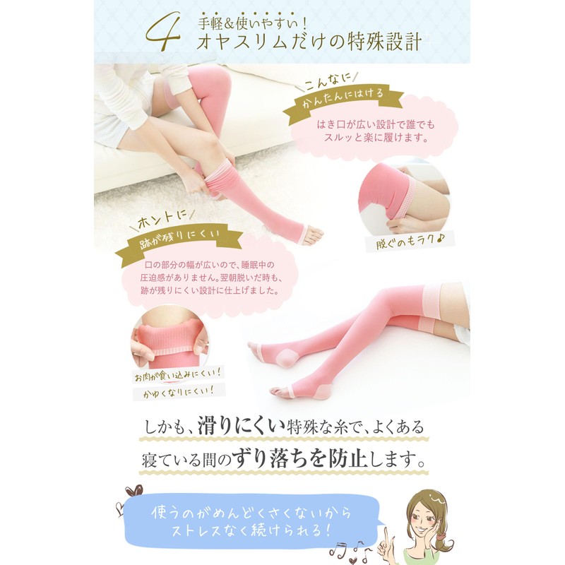 • [Care for blood flow while sleeping, due to poor blood circulation caused by standing work] Oya Slim Platinum night is not only attention to lympha, but also the veins. Unique ergonomic technology provides a level of firmness that won't interfere with your sleep. It won't leave marks even when you take it off the next morning. In addition to the "over-knee" covering the calf, we have also provided two types of "full-length" that covers the thigh