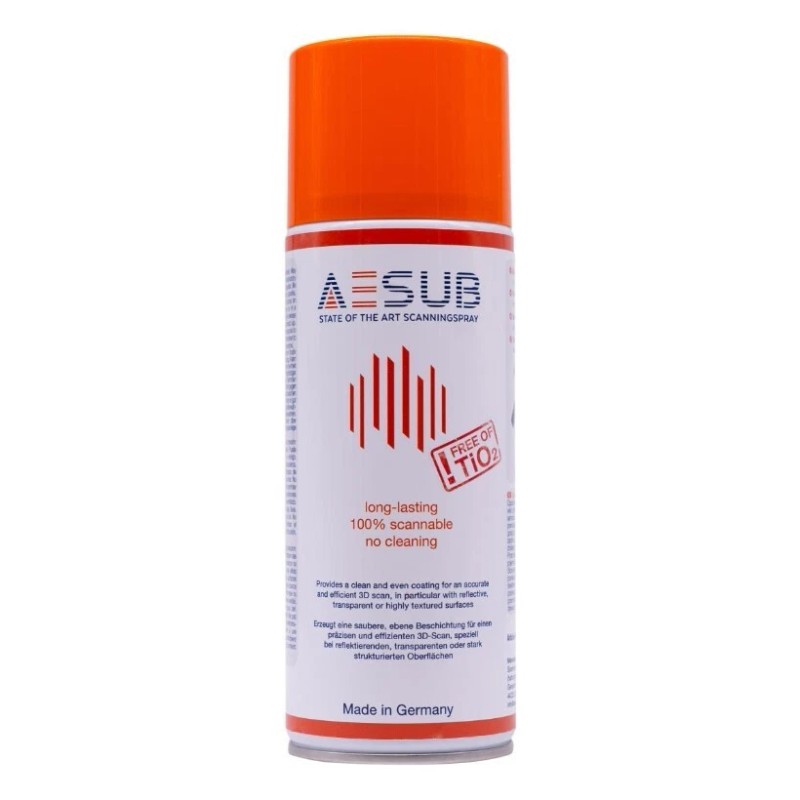 AESUB orange is a long-lasting self-volatilizing scanning spray developed by scanning experts. It eliminates basic application problems of 3D metrology, especially in sensitive areas (laboratories, production, etc.) and protects the equipment from contamination by deposition of pigments. Expensive transports of externally matted measuring objects to the sensor as well as the time-consuming cleaning of the measuring environment and objects after scanning are no longer necessary. With AESUB orange, you achieve a significant increase in efficiency and productivity in the entire digitization process.