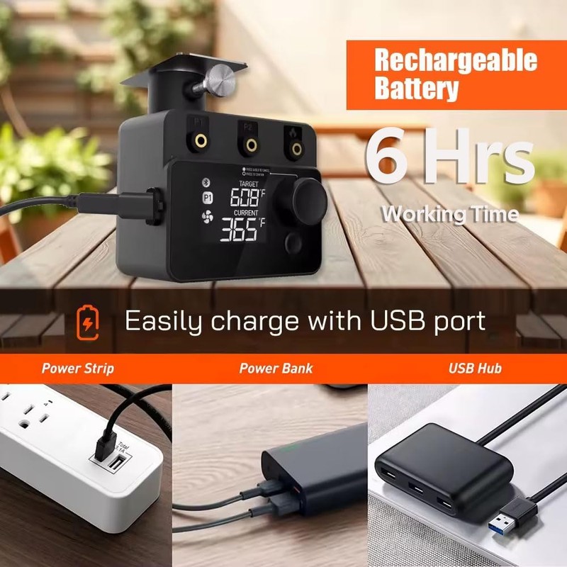 - PORTABLE & RECHARGEABLE: Powered by a long-lasting lithium battery, this BBQ controller operates for up to 6 hours on a single charge (type-C charging cable included). Its portability ensures you can cook anywhere, and in case of a out-off battery outdoors, it can be powered directly by a charger or a powerbank, CAN BE USED WHILE CHARGING