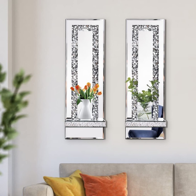 - DECORATIVE ACCENT : Beveled Silver Mirror with Crushed Diamond rectangle shape and Crystal clear shelf provide an extremely attractive look of FAMILY, Modern exquisite style that fits in with a variety of interiors home decoration. Perfect elegant stylish decor for wall decoration, Art Deco style. Best for Gifting.
