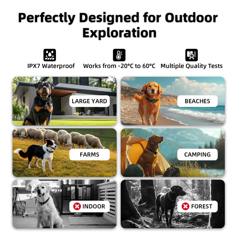 - 【Upgraded AI GPS Wireless Dog Fence System】Built with cutting-edge AI positioning technology, this GPS wireless dog fence provides accurate real-time location tracking and strong anti-interference performance to keep your dog safely within a customizable virtual boundary.(Note: This system is designed for outdoor use only and not be used indoors.)
