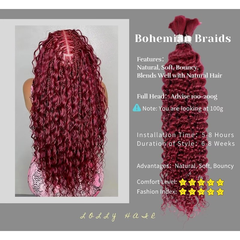 - More Widely Used: Human curly braiding hair offers great versatility, not only suitable for Bohemian Braids, Knotless Braids, Boho Locs, and Box Braids, but also allowing easy styling for different fashion-forward looks. It is a trusted product that empowers black women to embrace their unique style and charm while achieving multiple trendy hairstyles.