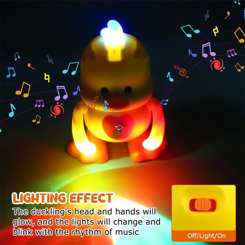- 🐤🐤【Lighting Effects】: Beating the dancing duck, it walks left and right to the rhythm of the music. The musical duck prepared for the babys head and hands will make a gurgling sound.The dancing ducks head and hands will shine. With the rhythm of music, the lights change and flicker, and it is more obvious to turn on the lights at night.