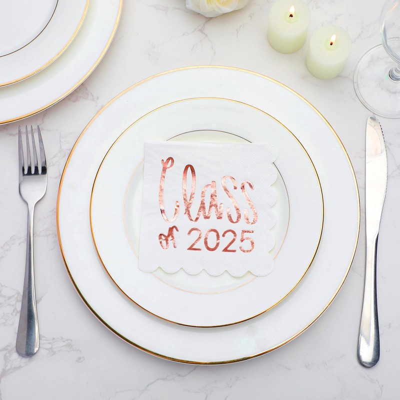 • Classic and Elegant: our 2 ply napkins come in a pristine white color with rose gold words for added sophistication; This elegant gold foil stamping, featuring the design"Class of 2025, " exudes luxury and style, making your graduation parties more chic and memorable