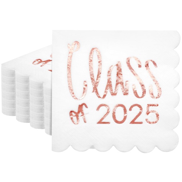 Affrolling 100 Pcs Class of 2025 Graduation Cocktail Napkins 5 x 5 Inch Congrats Grad Scalloped Paper Napkins for Dinner Beverage Graduate Decorations(Rose Gold)