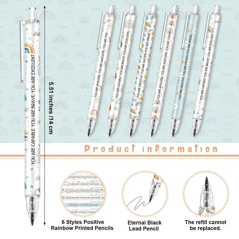 • Product Contains: you will receive 30 rainbow style inspirational eternal pencils in 6 styles and 30 positive cards, these portable student reward pens and cards can not only stimulate interest in learning, but also enhance self-confidence and sense of achievement; Suitable for Affirmation, welcome gift, first day of school, Back to school for students, classmates, classroom bulk