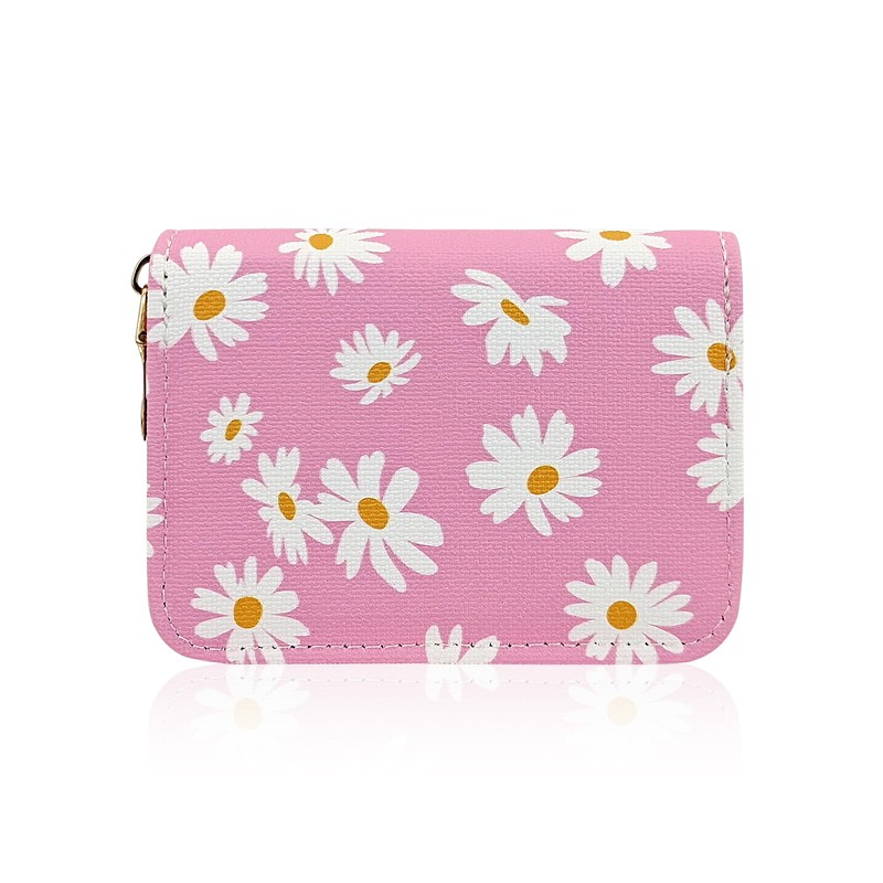 AfitLulu Credit Card Holder for Women, RFID-Blocking Daisy Prints Card Holder Wallet with Zipper 11 Slots Womens Card Organizer (Pink)