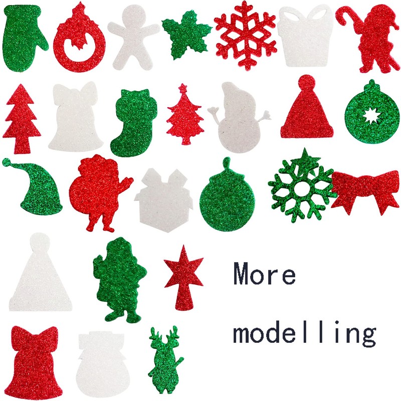 These foam christmas stickers are shaped like Santa Claus, elk, snowman, snowflake, bell, crutches, gift box, gingerbread man, Santa hat, gloves, Christmas stockings, Christmas tree, etc, meeting your various needs.