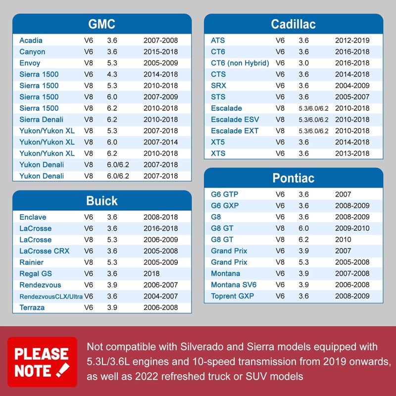 - 【Compatibility Notice】Before purchasing, please verify compatibility to avoid potential issues. While the AFM/DFM Disabler works with most GM V6 and V8 engines, it is not compatible with 2019+ Silverado and Sierra models equipped with 5.3L/3.6L engines and 10-speed transmissions, or 2022+ truck and SUV models.