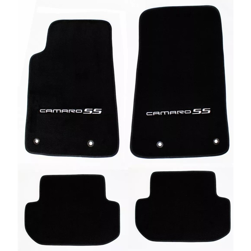 AFM NEW BLACK Floor Mats 2010-2015 Camaro Embroidered Logo and SS in Silver 4 pc SET