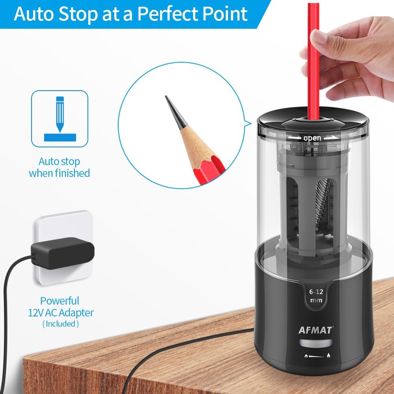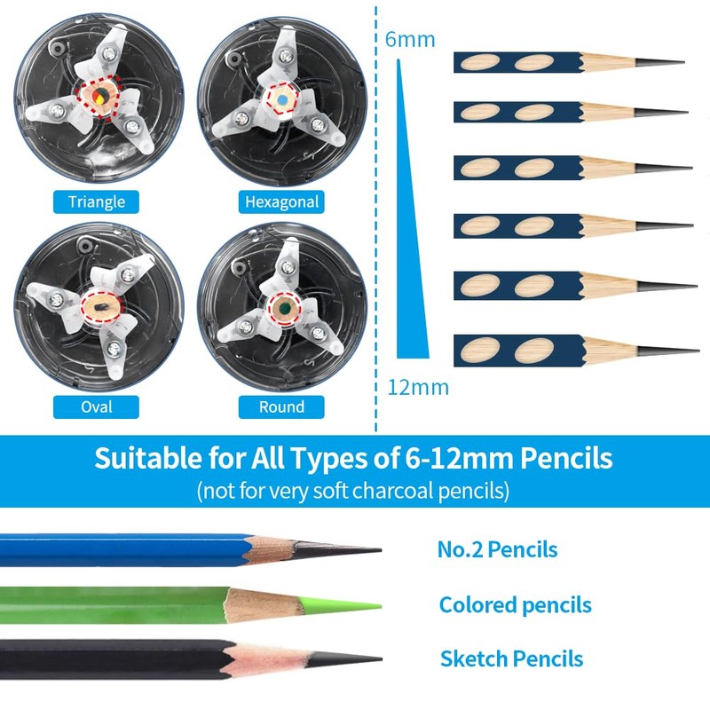 - 【Fit for φ6-12mm Pencils】Get this long point pencil sharpener for artists that takes both the small and the large pencils(φ6-12mm), almost every pencil fits in it perfectly: Artists' pencils, standard NO.2 pencils, and nearly anything around you. Auto sharpen and auto stop when it finishes off a point, no over sharpening any longer. The labour-saving design requires a gentle downward pressure on the pencil while sharpening, not too much hand pressure like most that hurts.