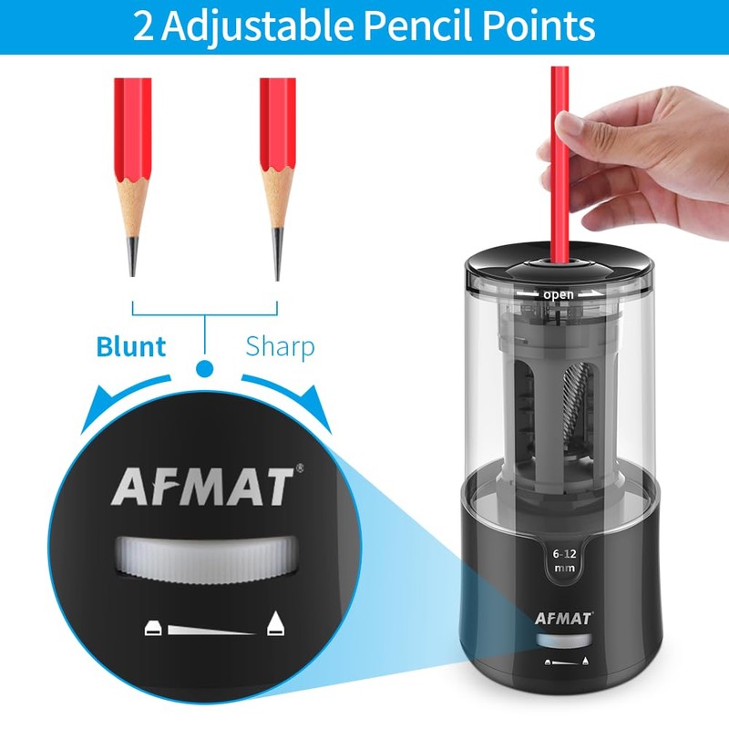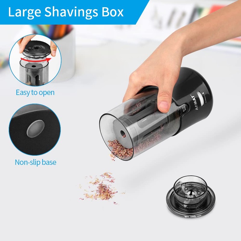 - 【Large Shavings Box】This afmat long point pencil sharpener shavings box is extra large and you don’t have to empty it every couple of pencils, but just take your time sharpening. The transparent shavings box tells when it’s full, and opens easily for emptying without a mess. Safety design built in, the sharpener won’t sharpen once the shavings box is removed or not well installed in the interest of children’s safety.