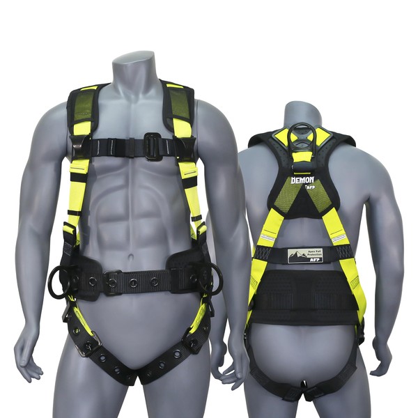 AFP Lime Green Demon Fall Protection Ergonomic Comfort Safety Harness, Soft Pressure-Relieving Perforated Breathable Padded Foam Shoulder, Legs & Back, 3 D-Rings, Tongue Buckle, Mating Buckle (OSHA/ANSI PPE)