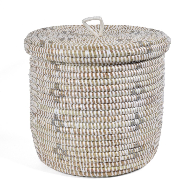 African Fair Trade Handwoven Lidded Shelf/Table Basket, White/Silver