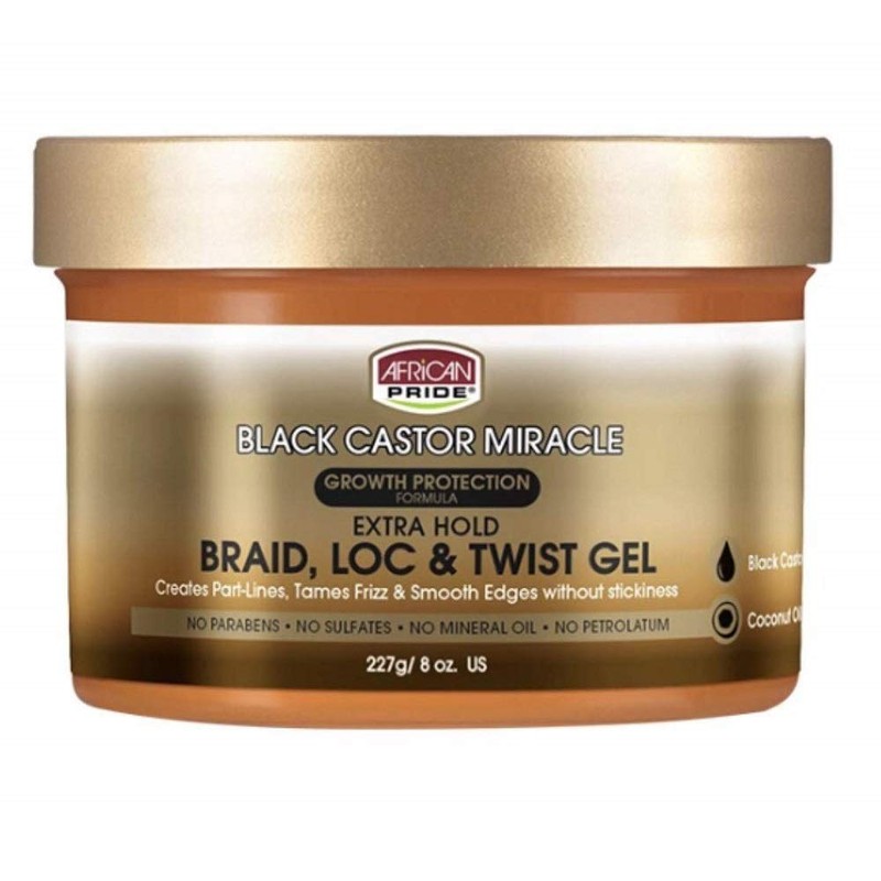 - PROVEN HAIR CARE - African Pride Black Castor Miracle Extra Hold Braid, Loc, & Twist Gel smooths frizz & flyaways while boosting shine for longer lasting styles. This professional product leaves braids, locs & twists neat & controlled.