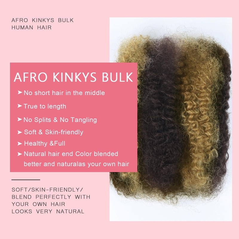 - Hair Material:Afro kinkys bulk hair is made of 100% human hair,healthy,natural,soft touch, can be dyed and bleached