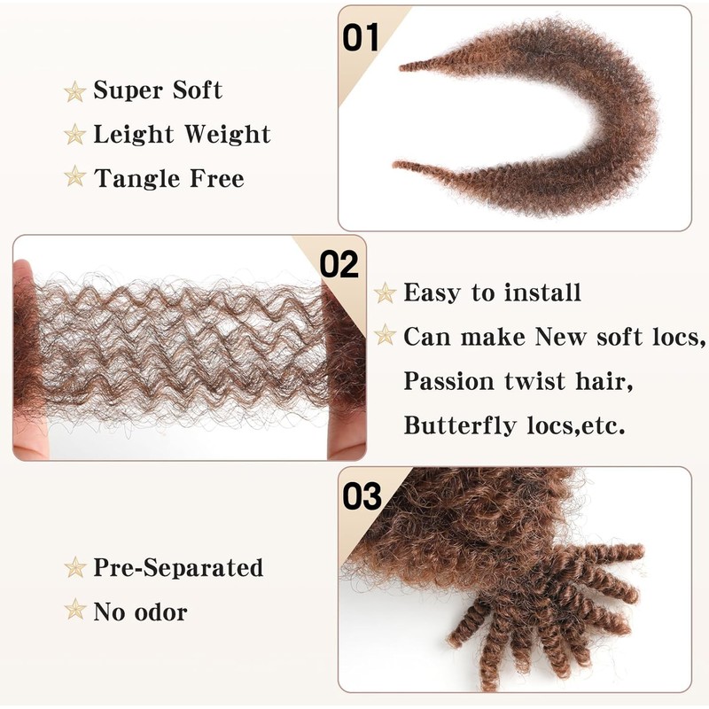 - Application Methods: Ideal For Butterfly Locs, Distressed Locs, Ponytails, Knotless Styles, Faux Ponytails, Wrapping Hair For Soft Locs And Crochet, Suitable For A Variety Of Braiding Styles To Achieve Your Desired Look, Whether That’s Crochet, Braided Or In Bulk, Our Afro Twist Hair Allows You To Achieve Your Unique Look