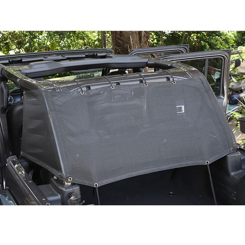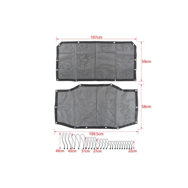 SHINEKA Sunshade is a black mesh screen made of lightweight, durable Polyester. With 15 bungee ball cords, it fastens snugly to your Wrangler’s roll bars, letting you answer the call of the open road while reducing UV rays that lead to harmful sunburn and fading & cracking of your vehicle’s interior surfaces. No tools are required, and it even fits under your hard top or soft top with the removal of just a couple of bungees.