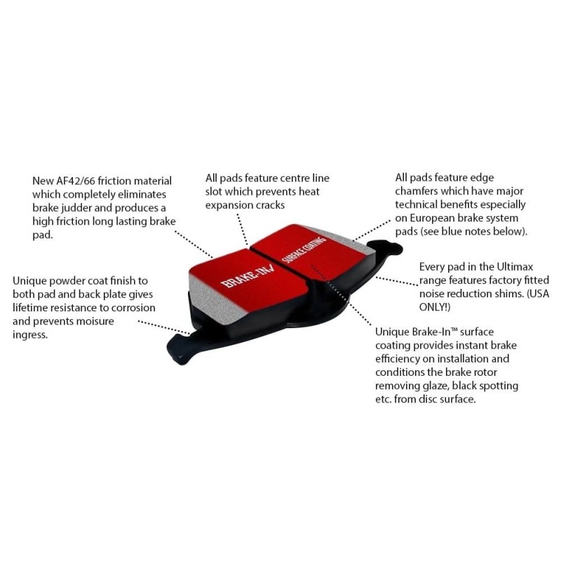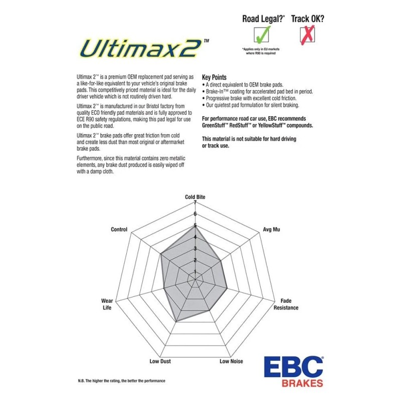 EBC Ultimax™ OEM Replacement Brake Pads are designed to match the exact dimensions of original equipment with extremely tight tolerances to ensure proper fit, even wear, and absence of rattles and squeaks. A patented low-metallic aramid compound uses DuPont Twaron composite to reduce the amount of steel wool necessary, so these pads cause far less abrasive wear on rotors without compromising brake pad efficiency or longevity. In government R90 tests of replacement brake components, EBC pads have shown to deliver equivalent performance, bedding, cold temperature operation, and speed sensitivity when compared to original manufacturer parts. EBC's aramid material also ensures the pads are soft enough to avoid brake squeal, but not so soft that pad longevity becomes compromised. On some German vehicles, you may even see longer life with EBC pads than the original factory brake pads provided.