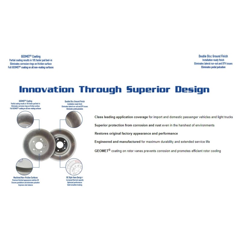 GCX™ rotors feature Elemental Protection™ GEOMET® coating on the friction surface that results in 10% faster pad bed-in while eliminating corrosion rings, as well as full Elemental Protection™ GEOMET® coating on all non-mating surfaces to inhibit rust formation. GCX™ rotors are double disc ground to eliminate DTV issues, and feature OE style vane designs and machined non-friction surfaces to restore OE looks and performance.