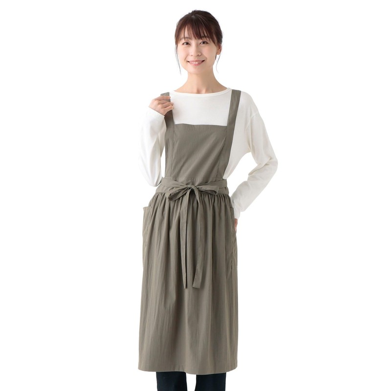 丈を長めに設定しており、ファッション感覚で使えるのが魅力のアイテムです。フロント部分にギャザーを施し、ふんわりと上品なデザインに仕上げました。フロントの両サイドにはポケット付きで、家事に必要な小物や髪留めなどを入れたいときに便利な仕様です。ウエストの前でリボンを結ぶタイプなので、フィット感をお好みに調整ができるのもうれしいところ。ご自身用にはもちろんのこと、これから新生活を迎えるご友人やご家族へのギフトにもいかがでしょうか。