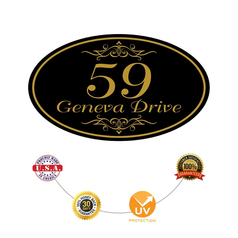 Afterprints Your Custom Name and Number House Home Office Store Shop Indoor Outdoor Wall Art Novelty Oval Aluminum Metal Sign Plate 12"x7" Black and Gold
