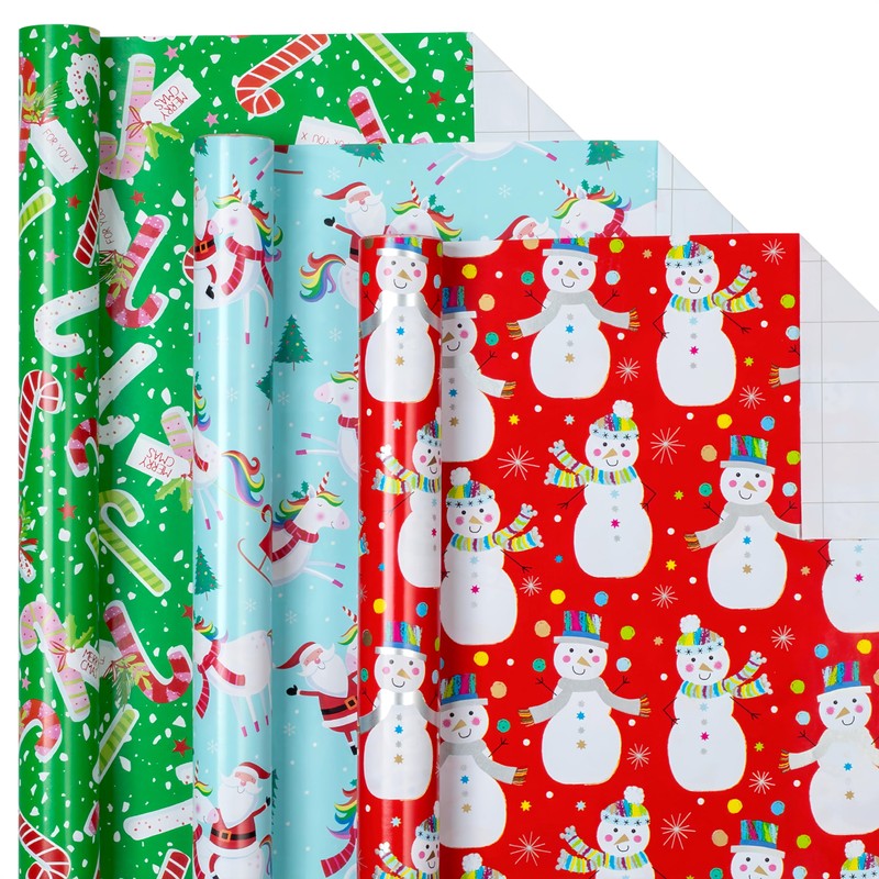 - 【Christmas Wrapping Paper Rolls】3 mini rolls designed with Christmas as the theme, the design packaging is very visually appealing. Unicorn and Santa Claus, snowman, candy cane wrapping paper make your gift packaging more unique and gorgeous! Share happiness and love, a gift is not just a material gift, but also an expression of emotion and love. This is especially true for hand-wrapped gifts.