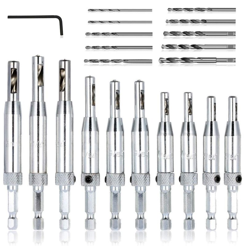 AFUNTA 21 pcs Center Drill Bit Set, AFUNTA Self Centering Hinge Tapper Core Hole Puncher 5/64' 7/64' 9/64' 11/64' 13/64' 5mm 1/4' & 1 Pcs Hex Key & 10 Pcs Replacement Drill Bits